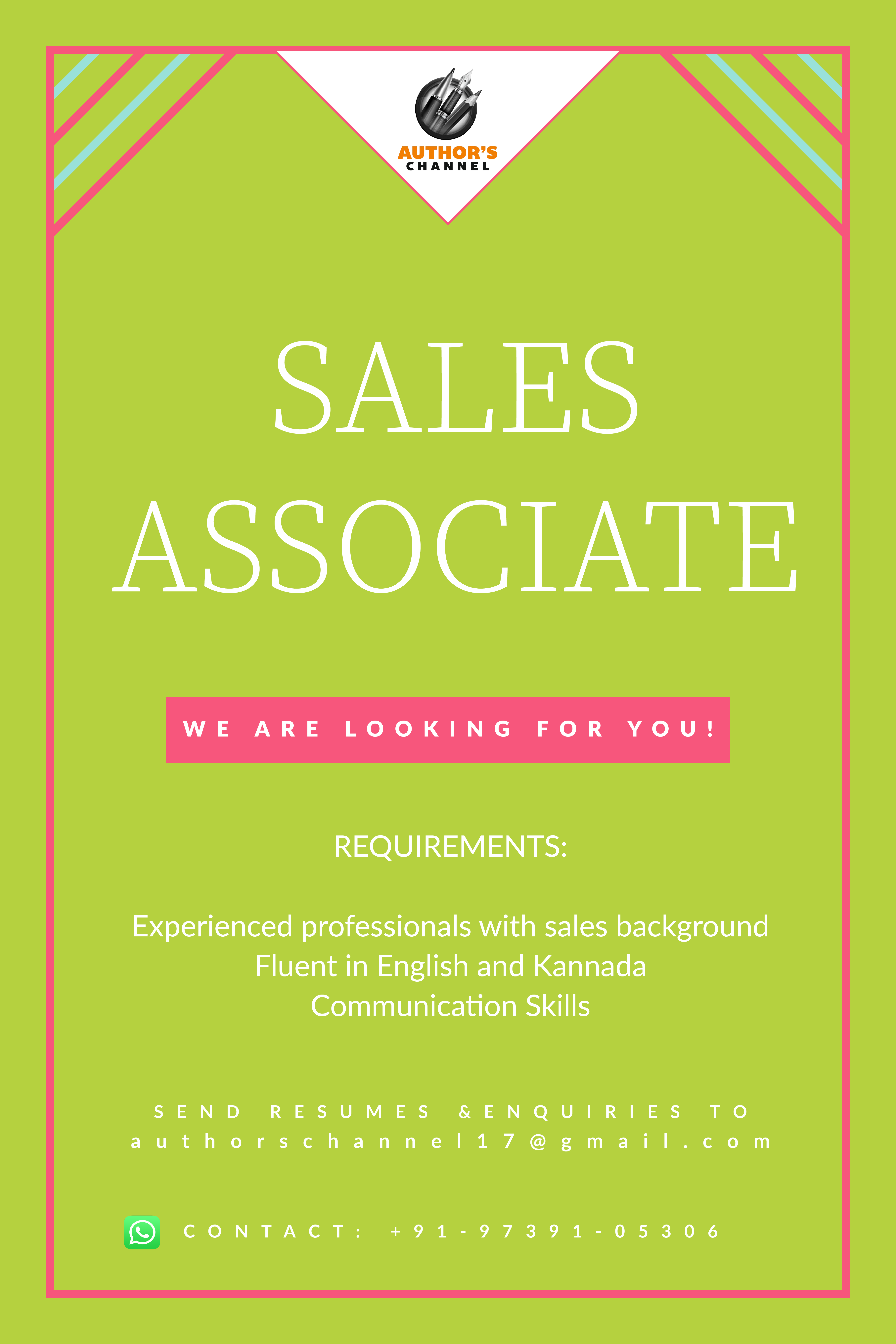 To apply for any of the below listed positions, applicants should submit a resume with relevant work and educational experiences and portfolios (wherever applicable) to Aruna Naidu at authorschannel17@gmail.com. All applicants must state the name of the position in the subject line of the email.